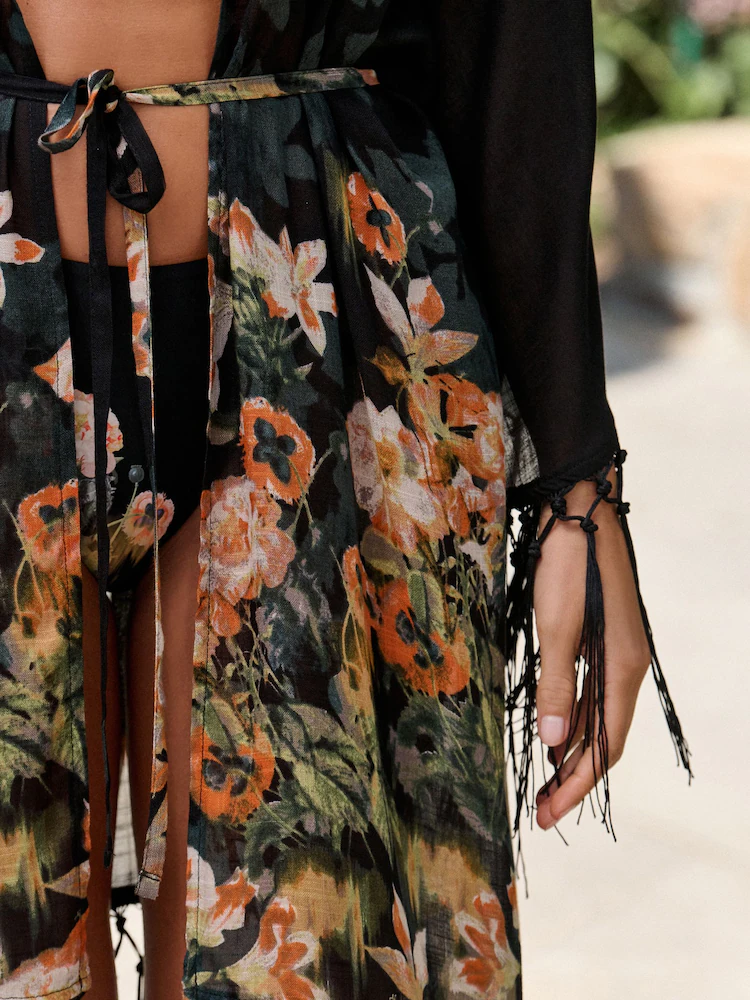 B by Ted Baker Viscose Tassel Kimono Black Koi Floral Cover-Up