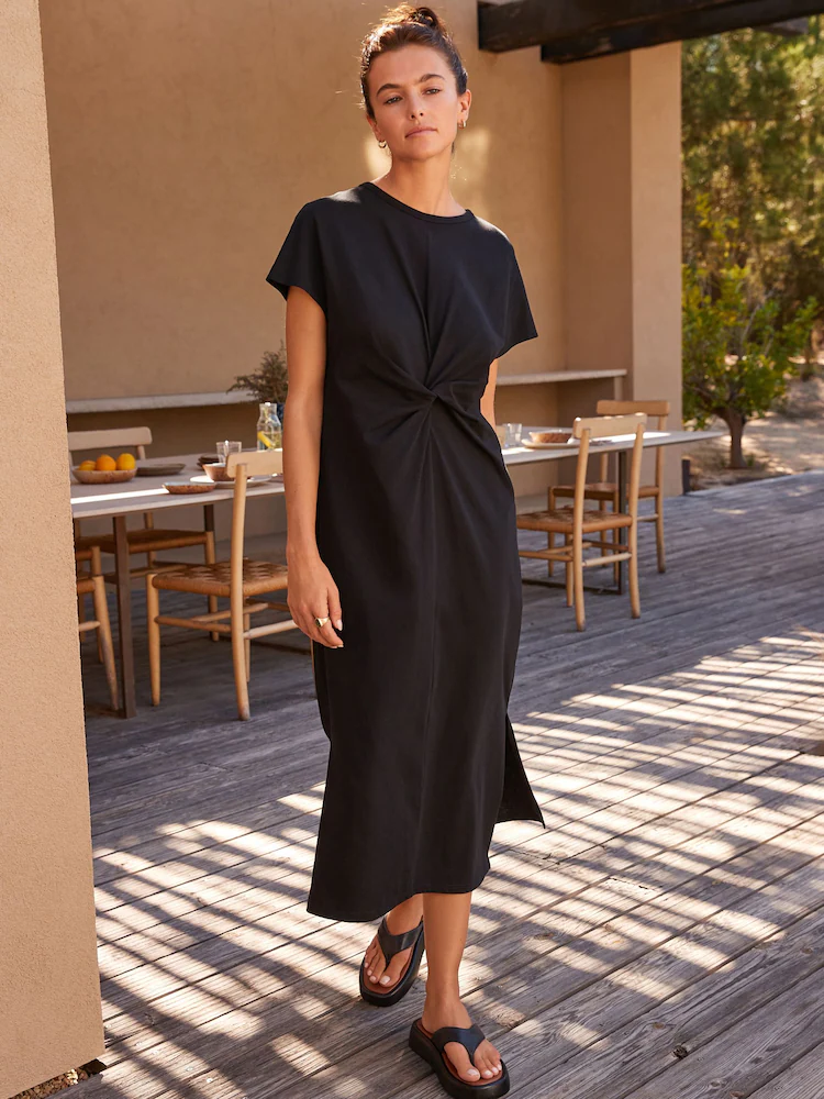 + Free ShippingThis casual black T-Shirt dress is crafted from breathable cotton, featuring a crewneck collar, twist detail to the waist, and a midi-length. Perfect as a holiday cover-up or for everyday wear.