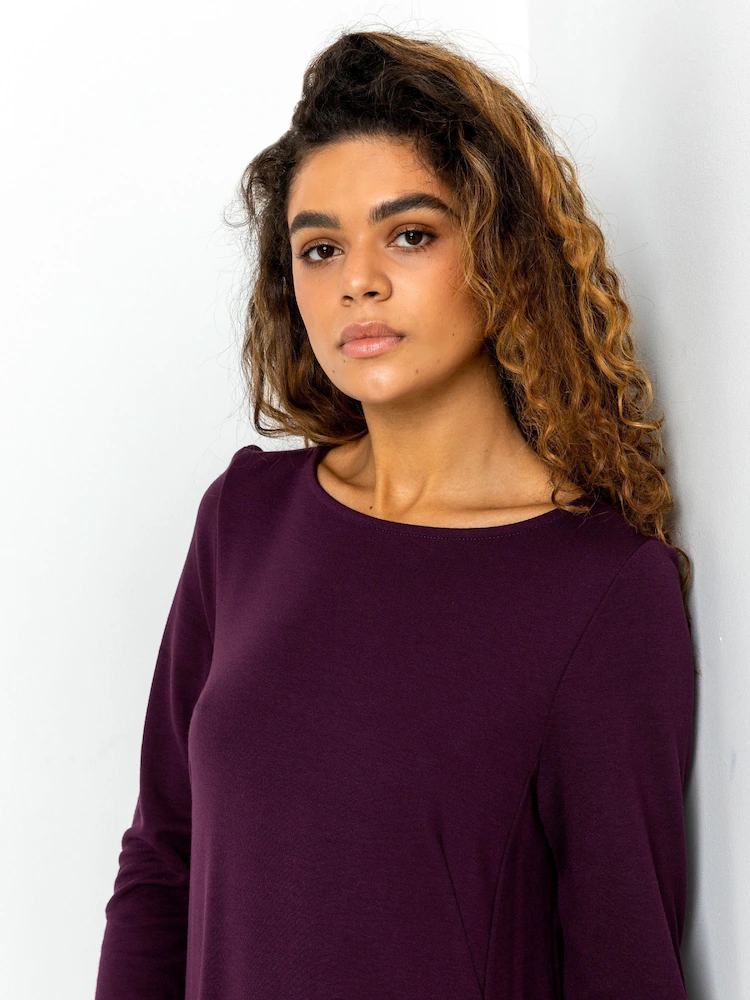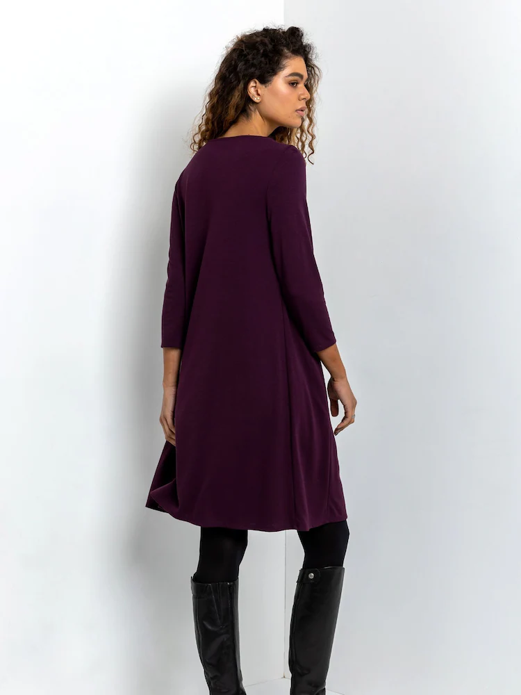 Finishing at a demure knee length, this A-line swing dress also features a classic boat neckline, 3/4 length sleeves, a flared skirt and two functional side pockets. Layer over tights or leggings and team with heels for a casual yet sophisticated daywear look that’s perfect for both work and play.