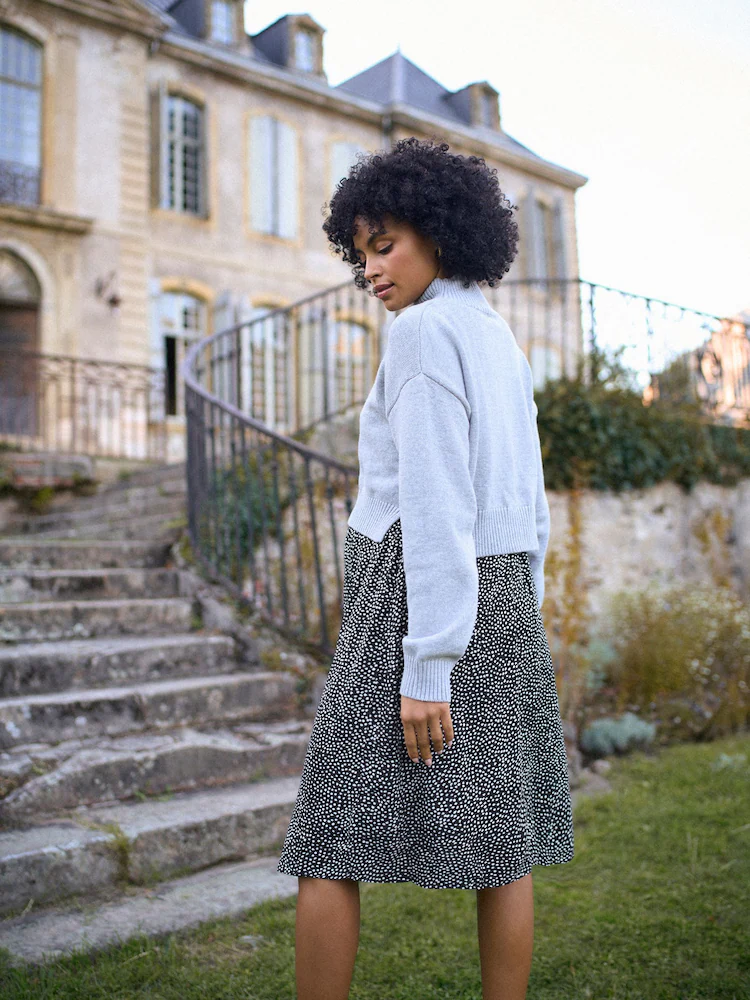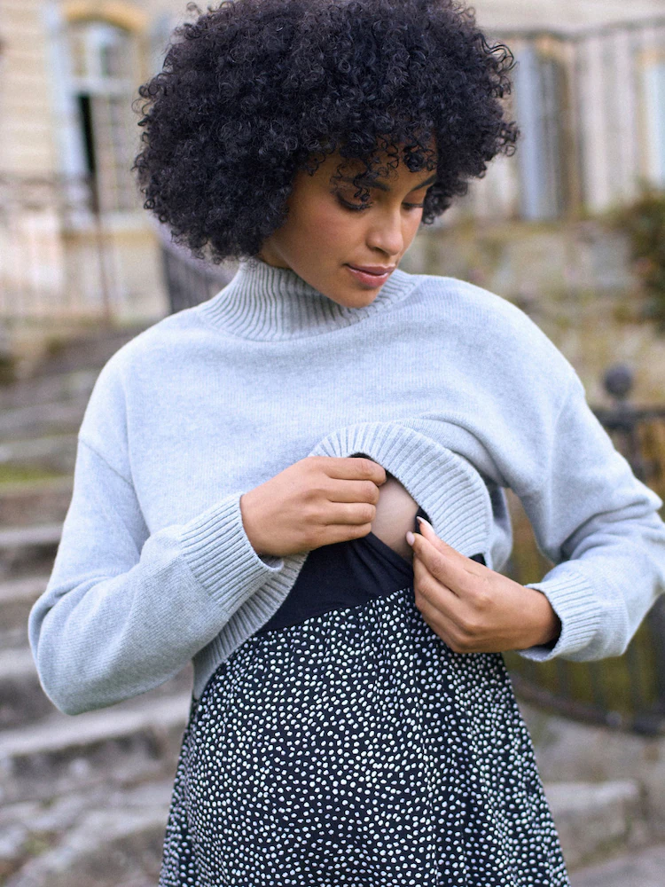 + Free ShippingLift up access for nursing or pumping A-line woven midi skirt with jersey nursing bodice Detachable, relaxed fit knitted top with funnel neck Long sleeves with ribbed cuffs Top & dress can be washed & worn separately Comfy, versatile & SO easy to wear, our Grey 2 in 1 Maternity & Nursing Dress is designed for pregnancy, breastfeeding & new mum life. The super-soft polka dot midi dress drapes beautifully & the relaxed knitted top is designed to offer an easy fit all the way to 9 months. After baby is born, the top lifts up to reveal a built-in jersey nursing bodice for breastfeeding or pumping. And the best part: the cosy knitted top is completely detachable. So, you can wear the two pieces separately or mix & match with other styles in your wardrobe. This dress is perfect for the office or easy everyday wear. Buy your pre-pregnancy size. With over 20 years of maternity expertise, Seraphine styles are designed to grow with you, adapting with you through pregnancy and motherhood.